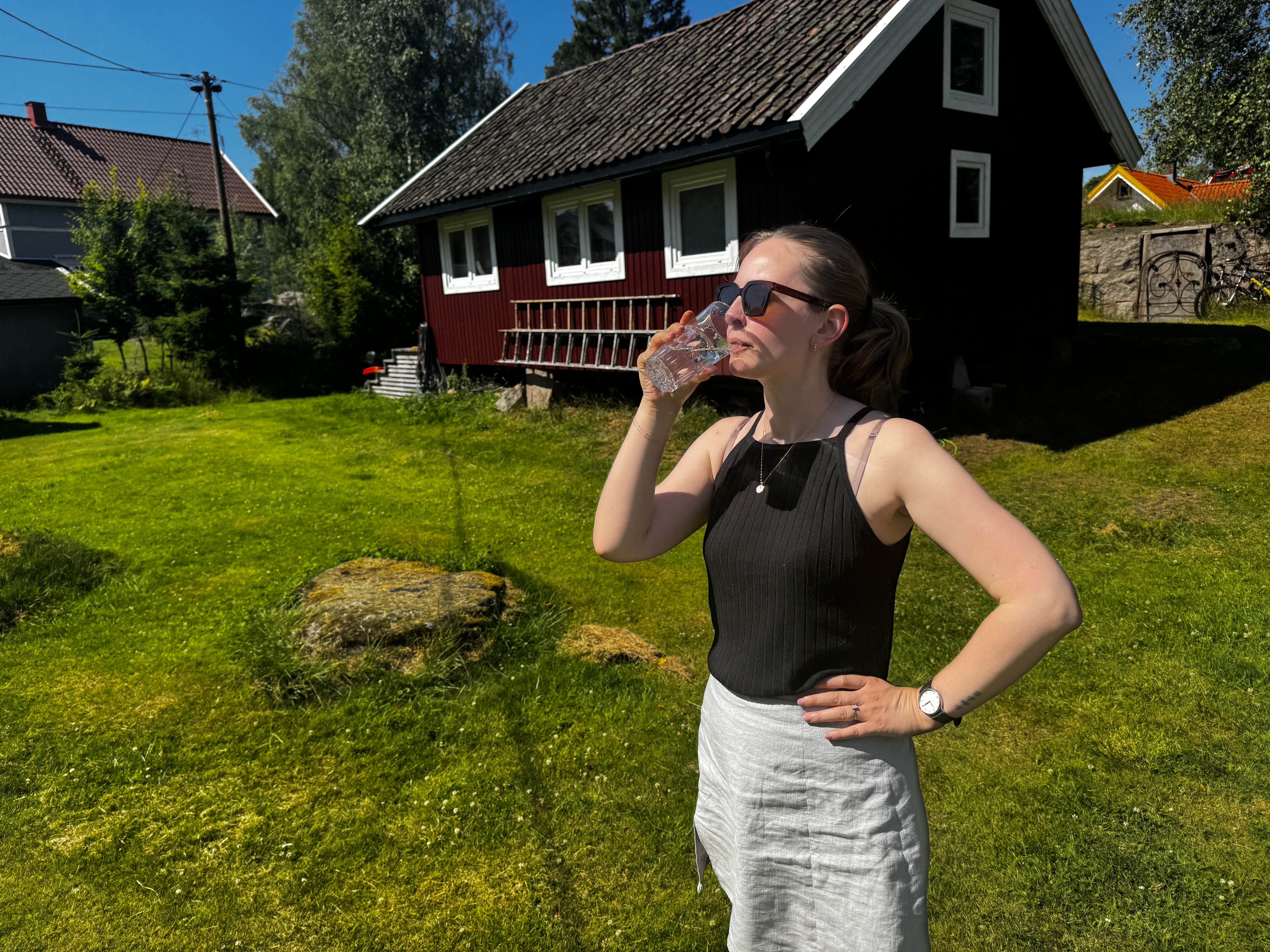Kroppen er avhengig av væske for å opprettholde livsviktige funksjoner og vi trenger mer vann på varme dager. Voksne i alle aldre bør drikke minst 1,5 liter vann i løpet av døgnet, så sant ikke legen har gitt andre råd. Barn trenger mer væske enn voksne, og det er derfor viktig å tilby drikke ofte. Vann er den beste tørstedrikken. Innta også noe salt ved mye svetting, med mindre legen har gitt andre råd.