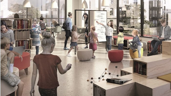 Skolen er kunnskapshuset og et sted hvor man leker og lærer. Bygget henvender seg både mot lek og idrettsplass og mot det sentrale torget som binder kvartalet sammen.