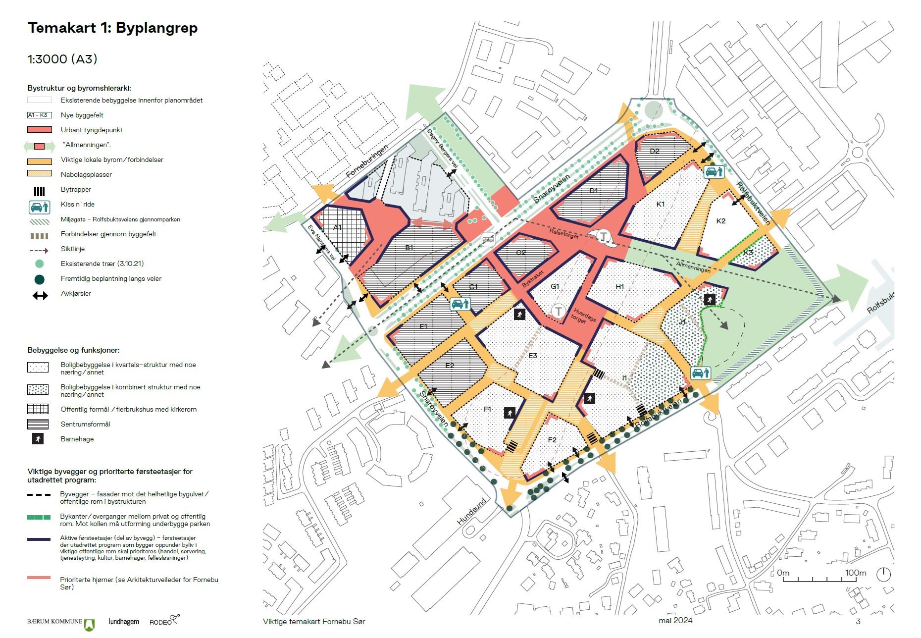 Til KDP3 ble det utarbeidet en overordnet prinsipplan for dette. Se utsnitt av denne for Fornebu sør nedenfor denne skal nå detaljeres.