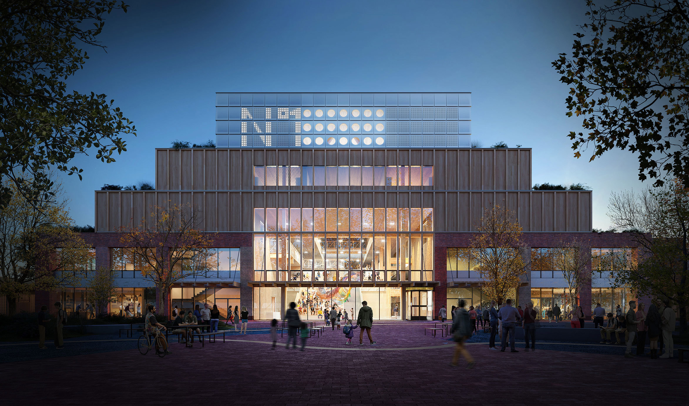 Tårnkvartalet consists of a secondary school for over 900 pupils, a cultural hall, black box, library, health center and cafe. The project's name refers to the site's unique cultural heritage consisting of the historic airport site and the remaining original airport structures, including the former flight tower.