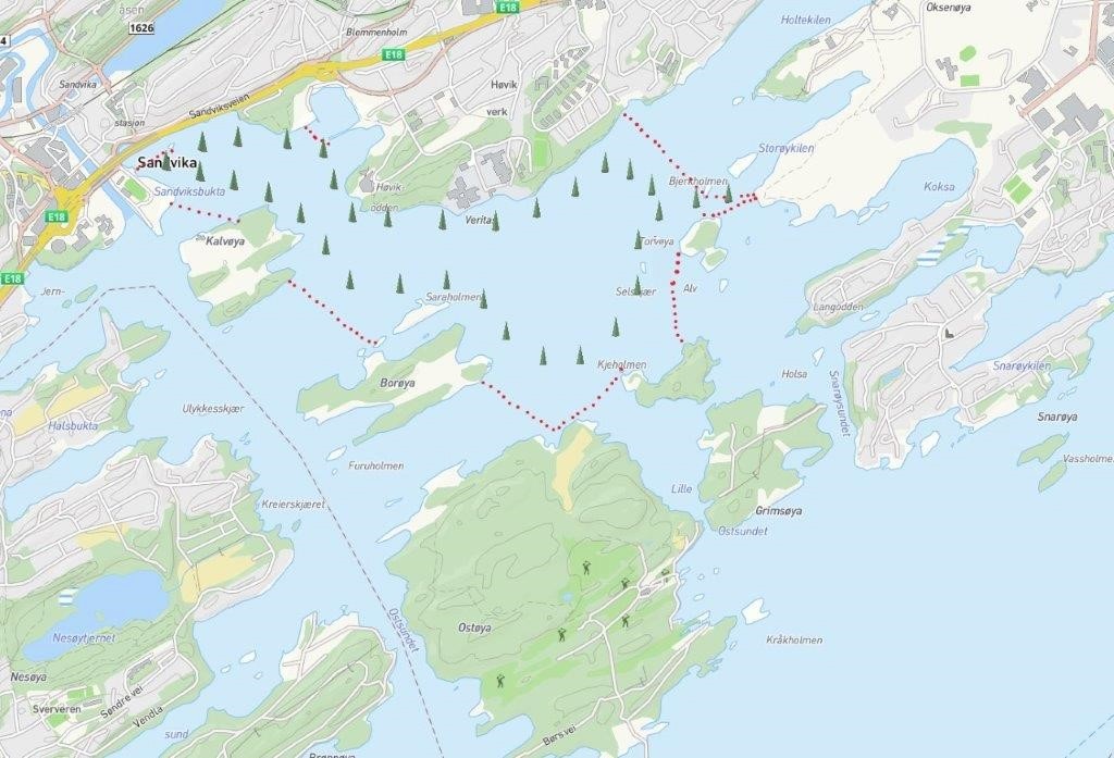Isoppsynet merker en rundløype (cirka 8-9 kilometer) på isen med granbusker. Det ytre området for hvor isoppsynet sjekker merkes med hvite trepinner behengt med sperrebånd. Områdeavgrensningen er på innsiden av øyene. Utgangspunktene for merket løype er Sjøholmen, Solvik marina, Henie Onstad, Sarbuvollen og Storøyodden. Kart over området kan du se under.