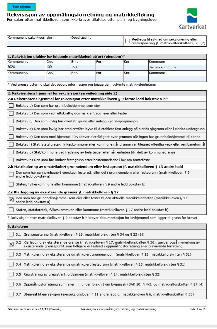 Se eksempel nedenfor på utfylling av side 1 og 2 av skjemaet «Rekvisisjon av oppmålingsforretning og matrikkelføring». Se også veiledningen nederst på skjemaets side 2.