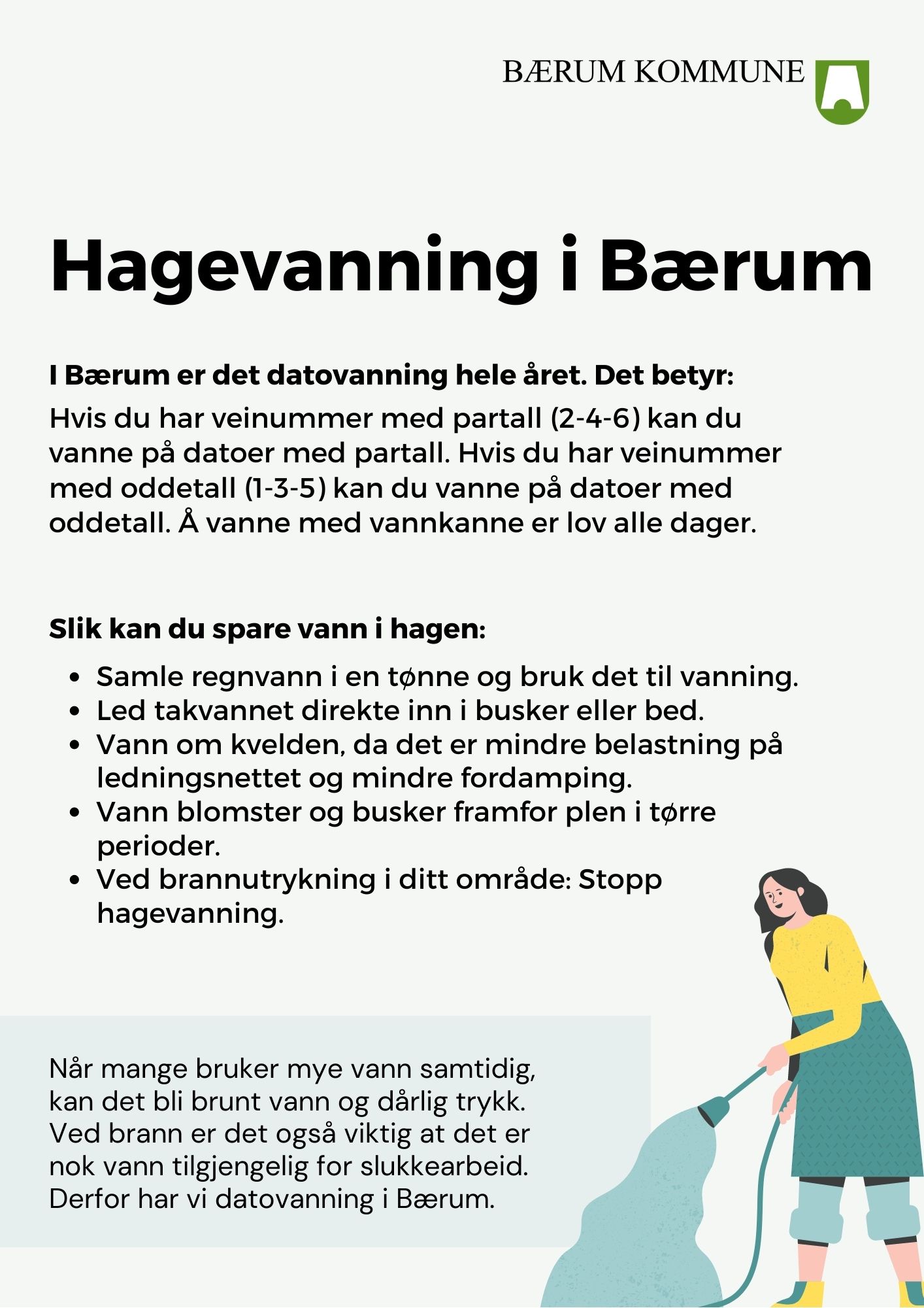 For at alle innbyggere skal få godt og nok vann til enhver tid, er det innført datovanning i Bærum. Høyt vannforbruk kan føre til dårlig vannkvalitet med brunt vann og dårlig trykk. Ved brann er det også viktig at det er nok vann tilgjengelig for slukkearbeid.